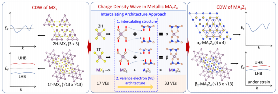 本论文提出了一种在金属MA2Z4材料中诱导与过渡金属硫族化合物中类似电荷密度波的新方法。该方法利用插层结构来保持相同的晶体场和费米面拓扑。研究表明,这些材料中的电荷密度波不稳定性是由d带和纵向声学声子之间的电子-声子耦合引起的,与过渡金属硫族化合物中的电荷密度波有相同的物理起源。通过利用临界电子-声子耦合常数将α-MA2Z4与1H-MX2材料结合,进而构建了半定量的电荷密度波相图。该相图证实了在具有相似晶体场的材料家族中扩展电荷密度波的可行性,并揭示了离子电荷转移和电子关联之间的竞争在电荷密度波不稳定性中的关键作用。研究进一步揭示了具有大卫星图案的β2-NbGe2N4单层中存在应变诱导的莫特转变。这项研究工作强调了插层构筑设计电荷密度波材料的潜力,扩展了对电荷密度波不稳定性和关联物理学的理解。