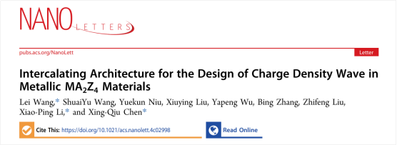 近日,我校王磊研究员和李小平研究员,联合中国科学院金属研究所陈星秋研究员在国际著名期刊Nano Letters上发表题为“Intercalating Architecture for the Design of Charge Density Wave in Metallic MA2Z4 Materials ” (Nano Lett. 2024, 24, 11279-11285)的重要研究成果,并被选为内部封面文章。该团队首次引入插层构筑方法用于设计二维材料中的电荷密度波。该研究得到了国家自然科学基金、内蒙古自然科学基金、内蒙古草原英才、内蒙古自治区本级引进高层次人才科研支持项目和OK138太阳集团骏马计划高层次人才引进项目的资助。