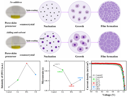 本研究提出了一种新颖的抗溶剂晶种法,用于优化宽带隙钙钛矿晶粒的生长,从而显著提高钙钛矿太阳能电池的性能。我们在钙钛矿前驱体溶液中引入三种常用的抗溶剂——乙酸乙酯、异丙醇和氯苯,以诱导晶种的形成,促进后续的晶核生成。这种方法有效增大了晶粒尺寸,减少了薄膜缺陷,并改善了薄膜质量,同时释放薄膜中的微应力。最终,利用抗溶剂晶种法,特别是采用异丙醇的处理方式,制备的带隙为1.647 eV 的宽带隙钙钛矿太阳电池达到了20.61%的功率转换效率,显著提高了宽带隙钙钛矿太阳电池的性能和稳定性,为太阳能电池技术的进步提供了有力的支持。