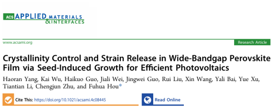 近日,我校物理学院侯福华研究员课题组在宽带隙钙钛矿太阳电池吸收层调控方面取得了重要研究进展,相关成果发表于国际著名期刊《ACS Applied Materials & Interfaces》上,题为"Crystallinity Control and Strain Release in Wide-Bandgap Perovskite Film via Seed-Induced Growth for Efficient Photovoltaics"。