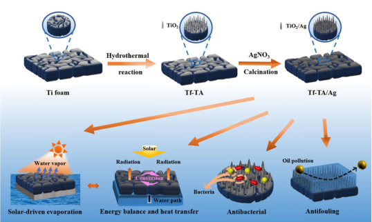 太阳能海水淡化是一种不消耗常规能源、无污染、所得淡水纯度高的海水淡化技术。其设备的核心材料是能够耐海水腐蚀和污染的高效太阳能光热转换传递材料。如何实现在改善太阳能光热转换材料的热传递和热转换效率的同时提高材料的抗污染能力,是一个有挑战性的问题。本工作找到一种合适的改性方法从四个方面同时优化钛基材料,将钛泡沫作为基底材料成功合成了掺杂银元素的TiO2纳米阵列,Tf-TA2/Ag样品具有良好的光热性能,增强了海水蒸发和除盐能力。同时此材料还具有持续的优异抗菌、抗油污性能,在不同水源的水处理方面显示出巨大的潜力,这种“一石四鸟”的做法为提升太阳能海水淡化设备中核心材料性能的研究提供了新的视角。