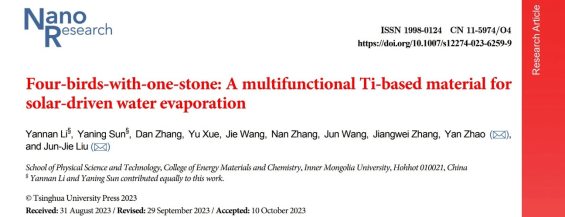 近日,ok138cn太阳集团529刘俊杰教授研究组与能源材料化学研究院赵岩研究员合作指导研究生在具有高效抗菌防污性能的太阳能光热转换材料方向取得新进展,相关成果以“Four-birds-with-one-stone: a multifunctional Ti-based material for solar-driven water evaporation”为题在国际知名期刊Nano Research发表。Nano Research是由教育部主管、清华大学主办的高水平国际学术期刊, 在“中国最具国际影响力学术期刊”榜单中排名进入前10名。(论文链接:https://www.sciopen.com/article/10.1007/s12274-023-6259-9)