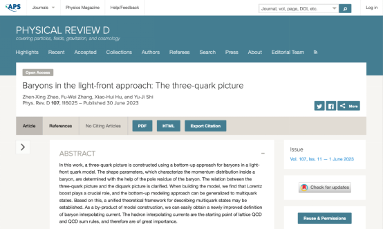 近日,我院赵振兴副研究员在国际物理学著名期刊Physical Review D[科睿唯安最近公布的2022年影响因子为5.0,WOS期刊分区为一区]上以“Baryons in the light-front approach: The three-quark picture”为题发表了在夸克模型领域的最新进展。论文链接:https://link.aps.org/doi/10.1103/PhysRevD.107.116025。