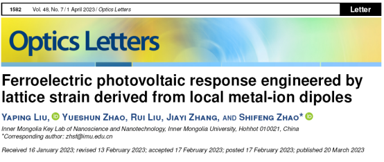 近日,我院赵世峰教授课题组在铁电材料光电转化领域取得新进展,题目为“Ferroelectric photovoltaic response engineering by lattice strain derived from local metal ion dipoles”研究成果在国际光学领域Top期刊《Optics Letters》(《光学快报》)上发表,(论文链接:https://doi.org/10.1364/OL.485829)。该期刊是美国光学学会(Optical Society of America,OSA)旗下物理-光学科学著名国际期刊,1977年创刊,涉及的研究主题覆盖光学科学各个领域,是光学领域最具代表性、认可度高、非常具有口碑的国际权威期刊。这是我校以及内蒙古自治区首次以第一完成单位在该期刊发表学术论文。