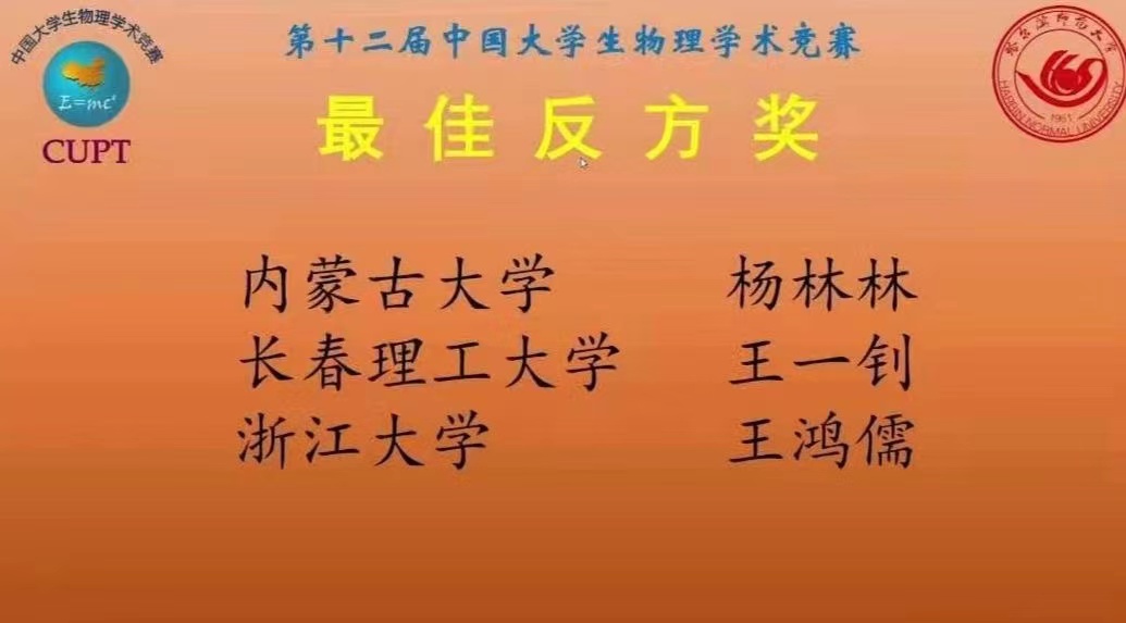 因受疫情影响,本届中国大学生物理学术竞赛国赛采用线上比赛的形式。参赛队分21组、每组三支队伍、根据3轮对抗赛中各阶段赛成绩的加权总和、确定排名。经过三天的激烈比拼,最终OK138太阳集团代表队以严谨认真的态度,踏实肯干的工作风格和扎实的理论基础,在本次国赛中OK138太阳集团代表队获得团队三等奖的成绩,并且我校代表队队长杨林林同学获得最佳反方奖的成绩。