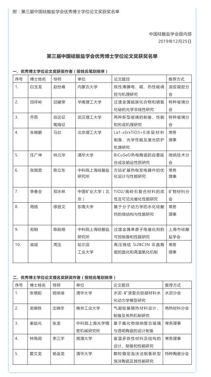 为鼓励创新、加强高层次创新人才的培养工作、提高我国博士研究生的教育质量,根据《中国硅酸盐学会优秀博士学位论文评选办法(试行)》,中国硅酸盐学会近日完成了第三届中国硅酸盐学会优秀博士学位论文奖评选工作。学会将候选论文按研究领域分为储能材料、陶瓷材料、薄膜与涂层材料、其他无机非金属材料4个组开展专家评审,11位相关领域教授或研究员参与本次评审工作。经候选人推荐、专家分组评阅及打分等评审环节,我校ok138cn太阳集团529赵世峰教授指导2018届博士毕业生白玉龙同学完成的博士学位论文“铁性薄膜电、磁、热性能调控与机理研究”荣获第三届中国硅酸盐学会优秀博士学位论文奖。