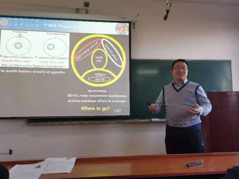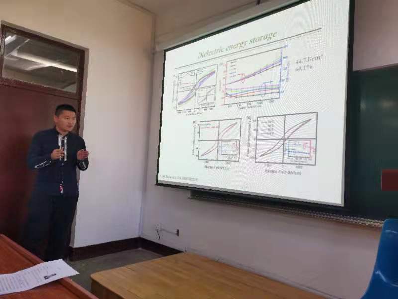 第一场报告由白玉龙主讲。他首先从团簇物质与铁性氧化物薄膜的多重耦合及衍生物性方面出发,深入浅出的为师生们讲解了薄膜、团簇、多重耦合等基本概念,同时结合在相关领域的收获给出了自己独到的见解,也向同学们分享了自己在读博期间的感悟和经验。