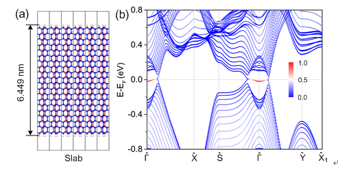图3. AHT-Si24 20个原子层厚度的Slab结构(a),及其表面态投影能带结构图(b)。