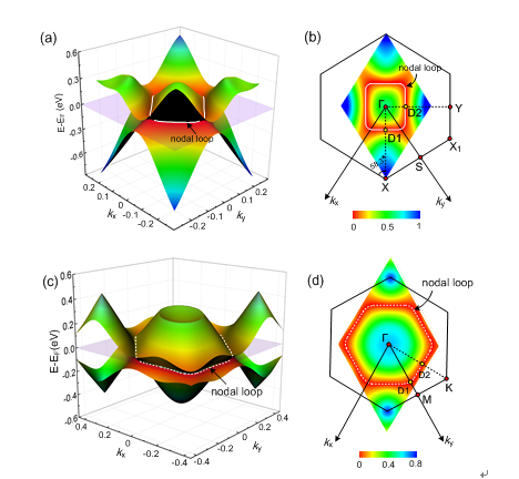 图2. AHT-Si24三维能带结构图(a),及其kxy平面内的节线分布(b);VFI-Si36三维能带结构图(c),及其kxy平面内的节线分布(d)。