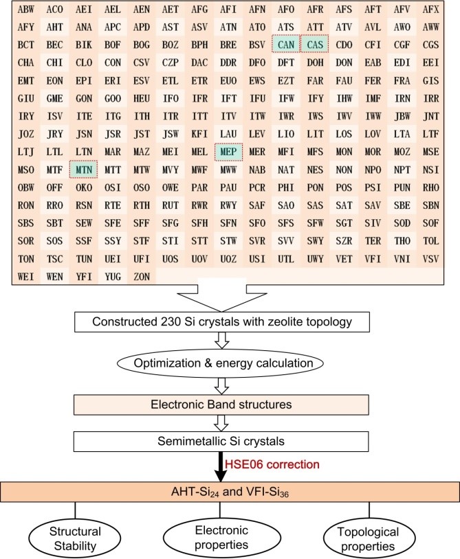 图1. 基于沸石结构数据库,搜索拓扑半金属三维全硅材料的计算流程图。