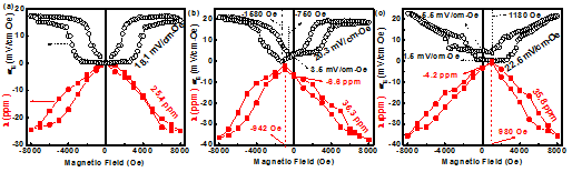 纳米团簇组装的多铁异质结Bi5Ti3FeO15/Ni-NiO/Bi5Ti3FeO15在室温下展示出可调控的交换偏置效应,其本质来源于异质结中核-壳团簇表面的自旋相互作用和磁畴结构对外磁场的依赖。在真空加磁场原位退火调控纳米团簇的表面自旋结构,获得了室温可调控的交换偏置效应。应力传递主导的磁电耦合和界面力矩作用导致的交换偏置在多界面体系中实现了由团簇界面自旋耦合调控所引起的室温偏置磁电效应。该结果如图1中所示,室温下有明显的磁电偏置,且偏置比率可以达到20%~24%,偏置场小于1000 Oe,低偏置场对应弱磁探测器件有较高的灵敏度。该工作对弱磁探测这