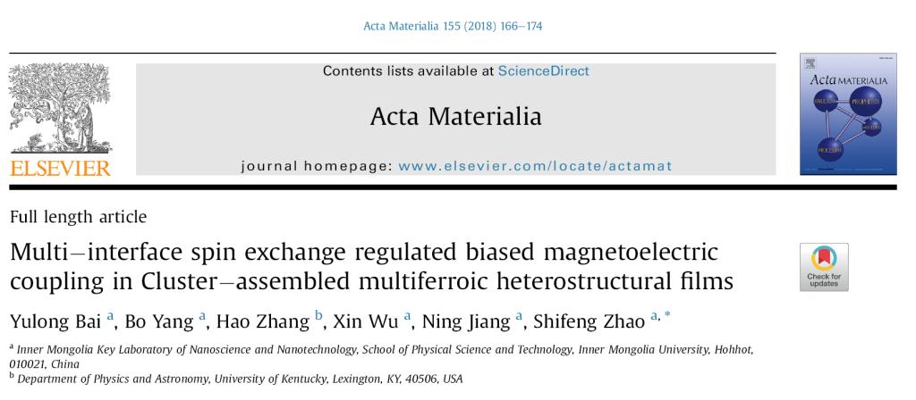 最近,由ok138cn太阳集团529赵世峰教授指导的2015级博士研究生白玉龙在纳米类TOP期刊Nanoscale发表后封面论文后,在室温偏置磁电耦合效应及弱磁探测器件设计方面又获得突破。相关成果以长文形式发表在金属材料顶级期刊Acta Materialia (SCI一区TOP期刊, 影响因子:6.036) ,原文链接为:https://doi.org/10.1016/j.actamat.2018.05.069。这是我校首次以第一作者和通讯作者单位在该国际顶级期刊上发表学术论文。