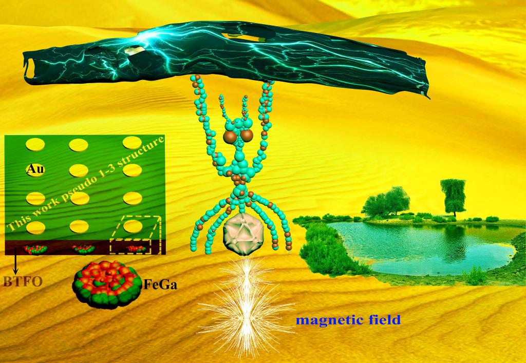 古人云“蚍蜉撼大树,可笑不自量”。由零维纳米材料—团簇组装的FeGa/Bi5Ti3FeO15纳米器件微加磁场,可获闪电之高压。正如图1中所绘蚍蜉(纳米蚂蚁)亦可撼树。该工作制备出团簇组装的赝1-3结构器件在室温下获得低场、高线性度的磁电耦合系数,8000 Oe下可达418 mV/cm∙Oe。对赝1-3结构器件进行多物理场模拟,进一步确定了多界面的应力耦合作用机理。该工作中团簇组装赝1-3结构器件设计策略和室温强磁电耦合数值在国际上尚属首例;其研究结果如同沙漠中出现的绿洲,为低成本磁电耦合传感器的市场应用提供了思路。论文以OK138太阳集团为唯一署名单位,作者依次为白玉龙(2015级博士研究生,完成样品制备和性能分析)、蒋宁(2017级硕士研究生,在数值模拟和图片设计中做出重要贡献)、赵世峰(ok138cn太阳集团529教授,通讯作者)。该工作得到国家自然科学基金(Grant Nos. 11564028, 11264026)、内蒙古自治区国家杰出青年科学基金培育基金(Grant No. 2014JQ01)的支持。