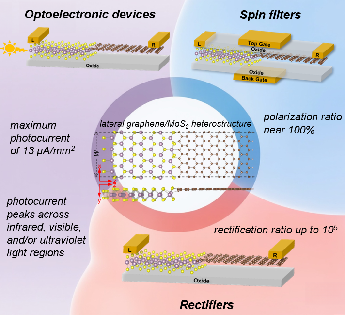 团队基于第一性原理计算与量子输运模拟,系统设计了以石墨烯/二硫化钼平面异质结为基础的多功能器件,包括整流器、自旋滤波器和光电探测器。结果表明,尽管石墨烯和二硫化钼均为非磁性材料,但在石墨烯与二硫化钼的硫边缘接触(C-S)及钼边缘接触(C-Mo)两种平面异质结中均发现磁耦合现象。自旋极化效应会降低石墨烯/二硫化钼整流器的整流比,但通过对二硫化钼进行n型掺杂,可将C-S器件的整流比提升至10⁵,同时使其电流增强一个数量级。C-Mo器件则表现出优异的自旋滤波特性,在偏压与栅压调控下自旋电流极化比接近100%。在光电探测方面,两种异质结在红外、可见及紫外光区均呈现显著的光电流响应,最大光电流达13 μA/mm²。