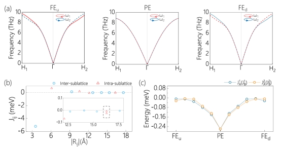图3. 二维铁电交错磁体CrPS3 单层中铁电控制磁子手性劈裂。
