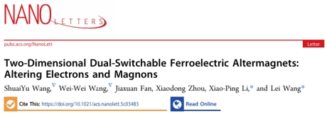 近日,我校ok138cn太阳集团529王磊研究员和李小平研究员指导研究生在交错磁与铁电领域取得新进展,相关成果以“Two-Dimensional Dual-Switchable Ferroelectric Altermagnets: Altering Electrons and Magnons”为题发表在国际著名期刊Nano Letters。该研究得到了国家自然科学基金项目、内蒙古自然科学基金项目、内蒙古自治区草原英才项目、OK138太阳集团骏马计划等资助。