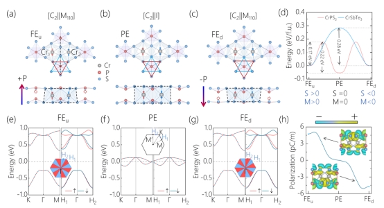 图2. 二维铁电交错磁体CrPS3 单层中铁电控制自旋劈裂。