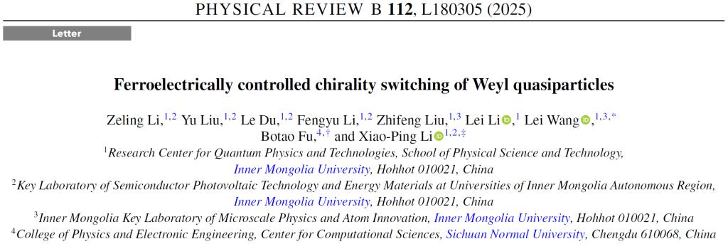 近日,我院李小平研究员和王磊研究员在拓扑量子态的操控方面取得重要突破,相关成果以“Ferroelectrically controlled chirality switching of Weyl quasiparticles”为题,以Letter的形式发表于物理学期刊 Physical Review B上。论文链接:https://journals.aps.org/prb/abstract/10.1103/mrls-4v3d。李小平研究员、王磊研究员与四川师范大学付波涛副教授为共同通讯作者,博士生李泽玲为第一作者,OK138太阳集团为论文第一完成单位。
