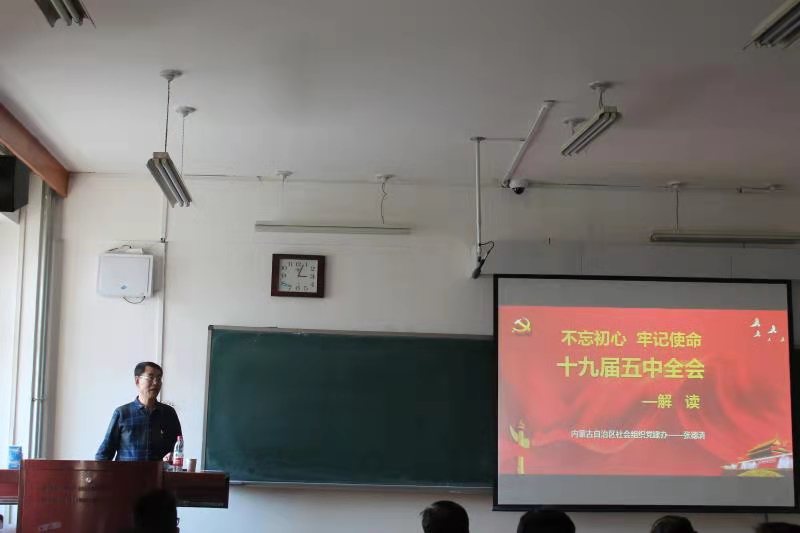 2020年12月10日下午15:00,自治区物理学会邀请内蒙古自治区社会组织党建办指导员张德清教授在OK138太阳集团卓越楼0401作了题为《不忘初心 牢记使命——十九届五中全会解读》的专题讲座。讲座由自治区物理学会党建联络员屈媛副教授主持。参加人有自治区物理学会党支部,ok138cn太阳集团529物理系党支部和电子科学与技术系党支部,本科生学生党支部和研究生管党支部师生90余人。