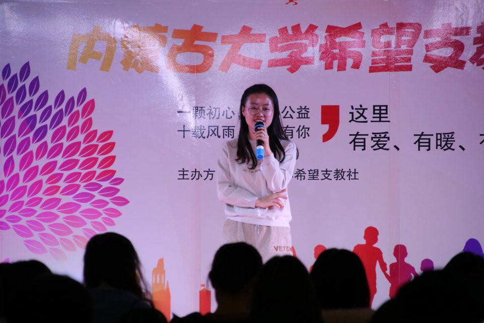 大三时,她担任了希望支教社社长一职,举办了很多公益活动:中央财政项目、新阳光病房学校合作方、百什户民族逸夫小学每周支教活动、达赖庄小学两周一次支教活动、中秋节寄信回家活动、重阳节关爱老人活动、内蒙古博物院友情合作方、希望支教社十周年庆典……社团也荣获标兵社团称号与芙蓉学子公益行动奖学金,在校评价很高。