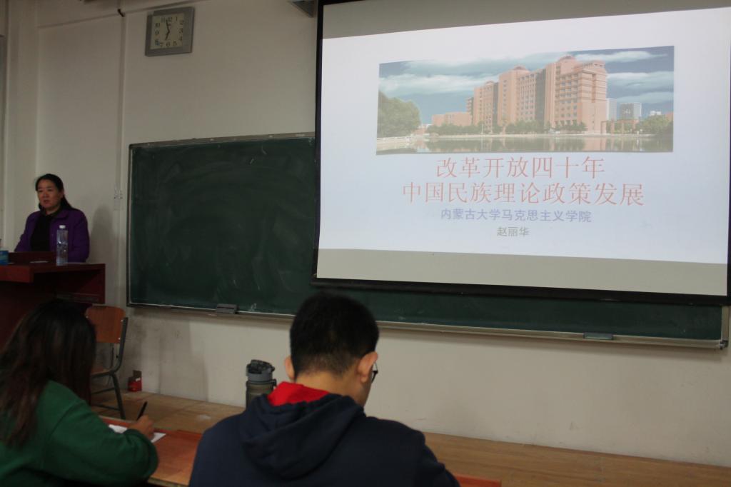 赵丽华老师以“改革开放四十年中国民族理论政策发展”为题,结合自身的经验,讲述了我国民族关系的本质特征,以及中国特色的社会主义民族理论体系的新内涵,加深了大家对新时代持续坚持改革开放重要性的认识,强调了各族人民要铸牢民族意识共同体的重要意义。