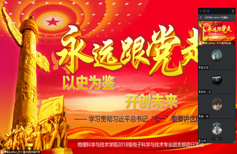 2018级电子科学与技术专业团支部以线上会议形式开展了此次活动,团支书带领同学们重点学习了习近平总书记“七一”重要讲话中提到的“九个必须”,回顾了百年奋斗征程。2018级数理基础科学(数理基地,物理)专业团支部全体同学观看了“习近平总书记‘七一’重要讲话”视频,2018级应用物理学专业团支部回顾了中国共产党人克服重重艰险,接连创造举世瞩目的伟大奇迹。同学们深切感受到,弘扬伟大建党精神,必须始终做到坚持真理、坚守理想。