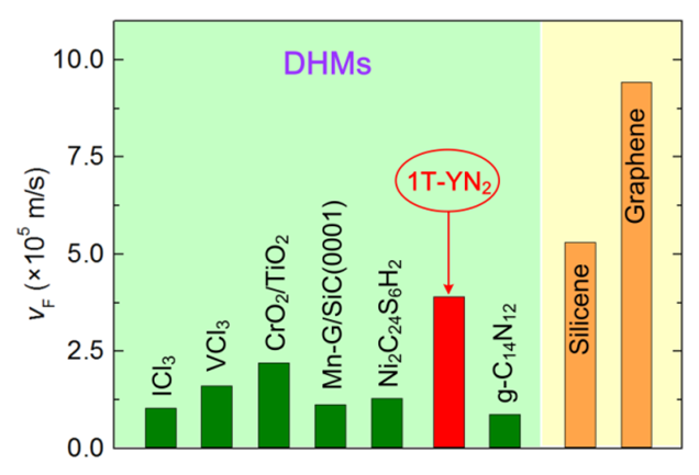 研究团队通过基于密度泛函理论的第一性原理计算及量子分子动力学模拟,在广泛测算的基础上,系统研究了单层YN2 的稳定性,电子性质及磁性。 结果表明单层YN2的八面体T相拥有诸多的奇异性质:1)较好的力学、动力学和热学稳定性;2)铁磁性基态,且居里温度大于室温;3)p电子贡献的单自旋狄拉克态,其费米速度高达3.74×105 m/s。 此外,它还具有较大的半金属带隙(1.53 eV),这足以克服因热扰动引起的自旋翻转。上述特性,使得YN2单层材料成为非常有前景的高速、低能耗自旋电子学的候选材料。