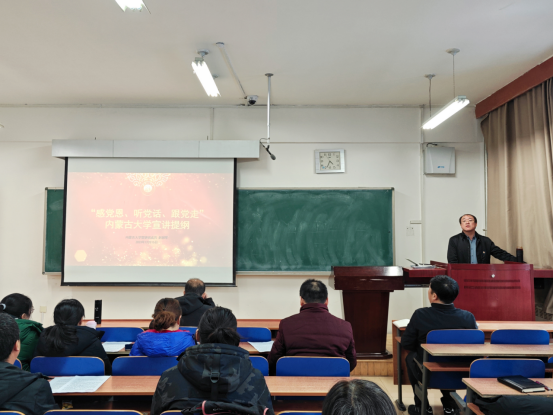 学校宣讲团成员、学院副院长赵国军进行了“感党恩、听党话、跟党走”主题宣讲,从深刻领会把握“五句话”的事实和道理、深切领会体悟习近平总书记对内蒙古的关怀厚爱和期望重托等方面进行了全面阐释,并结合学科建设和专业特色介绍学院贯彻落实《国务院关于推动内蒙古高质量发展奋力书写中国式现代化新篇章的意见》的具体举措。