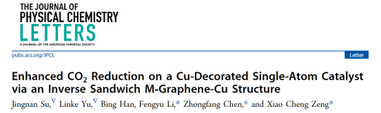 近日,我院李锋钰教授指导研究生在二氧化碳电还原领域取得新进展,相关成果以“Enhanced CO2 Reduction on a Cu-Decorated Single-Atom Catalyst via an Inverse Sandwich M-Graphene-Cu Structure”为题发表在国际知名学术期刊The Journal of Physical Chemistry Letters上。(论文链接:https://doi.org/10.1021/acs.jpclett.4c01858)该论文由我校李锋钰教授、波多黎各大学陈中方教授、香港城市大学曾晓成教授研究团队以OK138太阳集团为第一单位联合发表,并被编辑选为外封面论文。