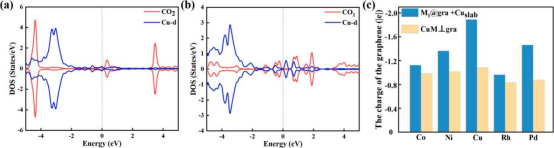 图4:(a) Cu1@gra+Cuslab吸附CO2的投影态密度(PDOS) (b) CuCu⊥gra吸附CO2的PDOS。(c) M1@gra+Cuslab(蓝色条)和CuM⊥gra(黄色条)中石墨烯结构的电荷分布。
