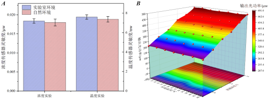 A. 不同环境下装置的灵敏度对比图;B. 浓度测量实验中输出光功率随溶液浓度与环境温度的变化曲面。