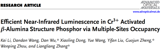 近日,ok138cn太阳集团529吴丹副教授课题组联合宁波大学郑国君副教授、中国科学院长春光学精密机械与物理研究所张亮亮副研究员等合作在Advanced Optical Materials期刊上发表了题为“Efficient Near-Infrared Luminescence in Cr3+ Activated-Alumina Structure Phosphor via Multiple-Sites Occupancy”的最新论文。该工作利用多格位占据策略,通过调控过渡金属Cr³⁺所处的局域晶体场环境,在β-氧化铝结构中实现高效近红外发光,其内/外量子效率分别高达 97%/42.6%,且由于材料具有较强的结构刚性,当温度升高到150 °C时,其发光强度仍能保持室温时的90%。该工作为近红外发光材料的内量子效率及热稳定性提升机理研究提供了重要的理论基础。