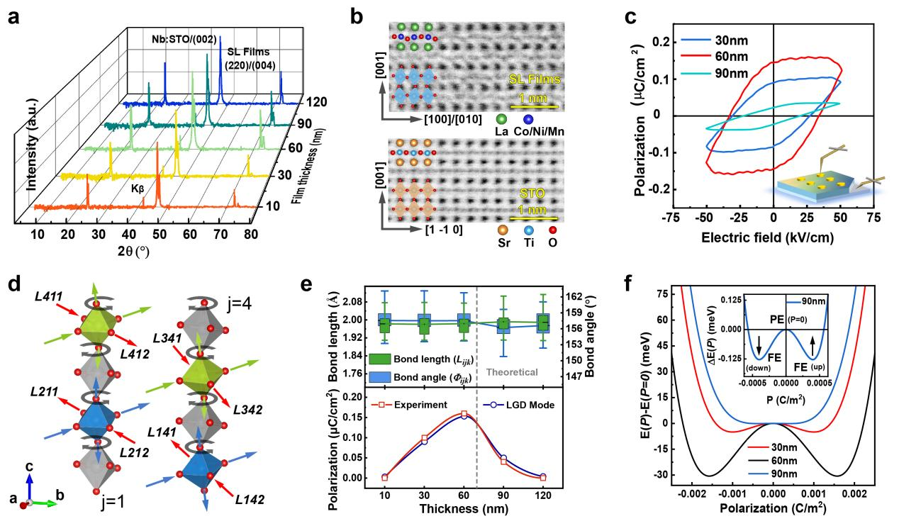 课题组通过臭氧辅助的材料生长工艺,实现高质量B位原子有序的双钙钛矿超晶格薄膜的生长。由于特殊的多晶轴取向契合的外延生长模式,超晶格薄膜在较小的晶格失配下实现了较大的应变传输厚度。通过精确控制厚度依赖的外延应变,在同一靶向氧八面体畸变模式(a-a-c+)下实现了八面体旋转和倾斜的长程调制,进而成功诱导并调控了La2NiMnO6/La2CoMnO6超晶格薄膜的杂化不当铁电性。这一策略摒弃了通过改变晶格失配来调节外延应变的常规方法,保证了氧八面体长程调制过程中靶向畸变模式的单一性和稳定性,有利于体系中杂化非本征铁电性的确认。并且,通过DFT计算和Landau-Ginsburg-Devonshire理论的铁电相变模型揭示了应变和八面体畸变对外延超晶格薄膜中铁电性的调节机制。