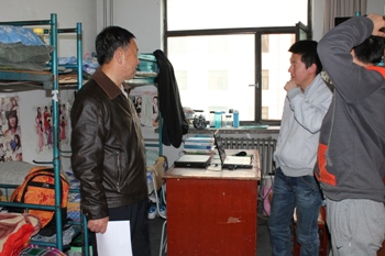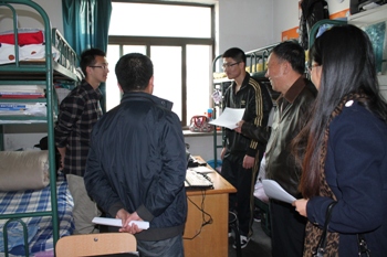 为保证学院学生宿舍安全,彻底消除学生宿舍安全隐患,2013年4月3日下午4:30,ok138cn太阳集团529党总支书记施道明、院长李前忠教授、副院长赵国军副教授、副院长、团总支书记谢峻鹏、本科生辅导员谷卓和学院各班级班主任、部分学生干部组成检查组,深入学生宿舍,对学生宿舍安全隐患和卫生等情况进行了全面检查。