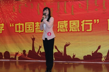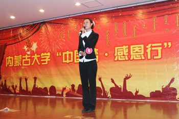比赛分自我介绍、主题演讲和即兴演讲三个环节。“自我介绍”环节中,通过别具特色的视频短片,选手们向观众展示了生活中别样的自己,使比赛精彩不断。在“主题演讲”环节中,选手们从不同角度切入主题,演讲内容异彩纷呈,内涵丰富。感恩国家、感恩父母、感恩老师、感恩朋友……选手们通过感人至深的文字、饱满的热情,神采飞扬的讲述了生活中无处不在的感人事迹,将感恩情怀诠释的淋漓尽致。其中,3号选手何源围绕作为内大人,如何感恩学校,从小处追寻中国梦进行主题演讲。“你有你的985,我有我的211。你嘲笑我们内蒙古是偏远地区,我会证明以后将会是谁的时代!”何源同学引用当前网络流行的“陈欧体”,充满自信的说出了作为内大人的骄傲与自豪,感染了现场所有观众。在最后的“即兴演讲”环节中,选手们随机应变,就自己所抽取的题目进行简短流畅的演讲,6号选手张宇飞讲述了生活在农村的父母的故事:“我想帮母亲去攆个猪,母亲说:‘孩子,你去学习吧。’我想帮父亲去挖树坑,父亲说:‘孩子,你去学习吧。’慢慢的,我成了家里的一个‘废人’。” 充满真情的演讲打动了现场所有观众,赢得了观众们的阵阵掌声。