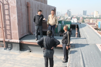 王贵印副校长对综合教学楼楼顶防水的老化情况做了全面细致的察看,并对防水工程的维修工作做了具体指示。在察看楼顶防水过程中,王贵印副校长亲自攀爬到距离楼顶面4米多高的蒙古包框架处组织现场人员讨论维修方案,令大家十分感动。