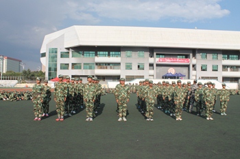 训练场地上,一个个整齐的绿色方阵以饱满的热情踏着整齐的步伐,喊着嘹亮的口号。教官们不厌其烦地示范、指导,同学们认真的做动作,整个训练场地中是一片如火如荼的训练氛围。尽管偶尔还会转错方向,队伍也未能够达到整齐划一的完美,但同学们毫无懈怠。时间分分秒秒地过去,渐渐的,烈日高照,而身边灰飞尘扬,浑身酸痛、挥汗如雨的同学们似乎越战越勇,在一次次不断重复的单调训练中诠释着坚韧不拔。站军姿,纹丝不动;练队列,规范敏捷。经过几天的训练,整个队列的动作在教官口令的引导下逐渐统一、整齐起来。我们看到了同学们坚毅顽强的一面,男生的稳健有力,女生的巾帼气魄,俨然已有了几分军人的风采。