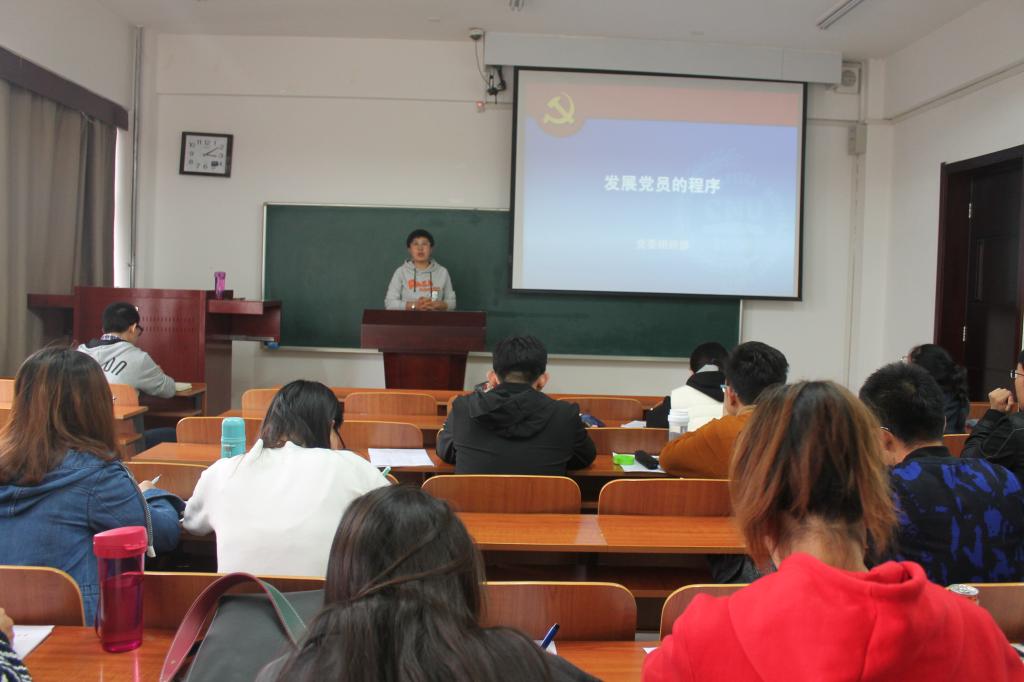 会上,李妮老师首先为全体党支部成员介绍了本科生辅导员赵喆,随后,对入党流程和规范进行了详细说明,并就“三会一课”、民主生活会和组织生活会、民主评议党员、主题党日等制度讲解了党有关规定,就强化责任落实,组织领导,督查考评等方面强调了党的组织领导的重要性。
