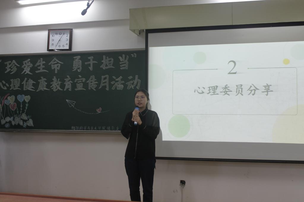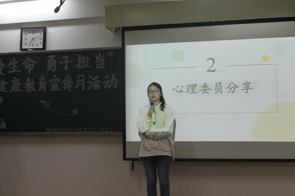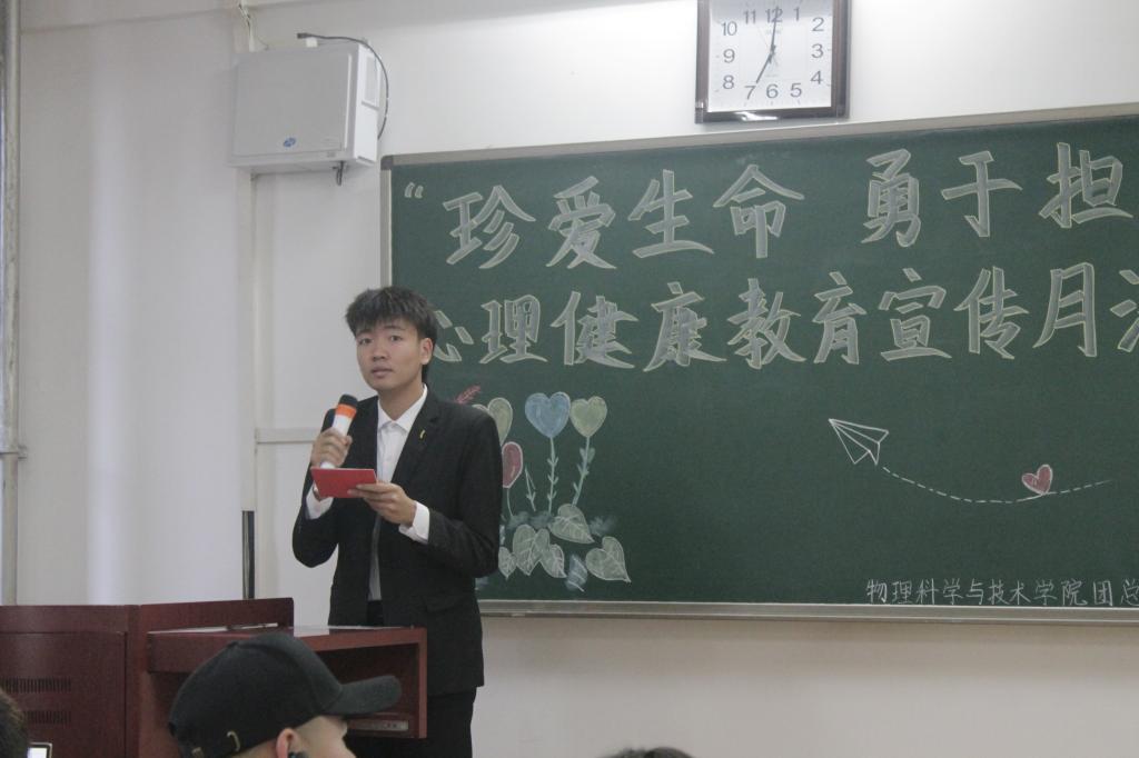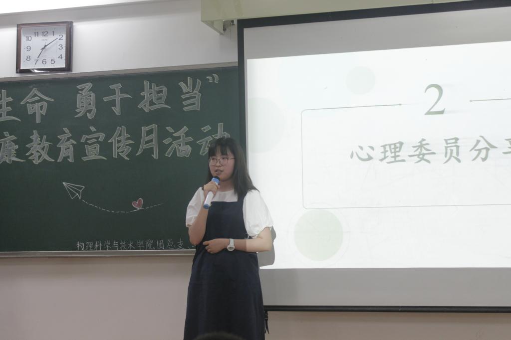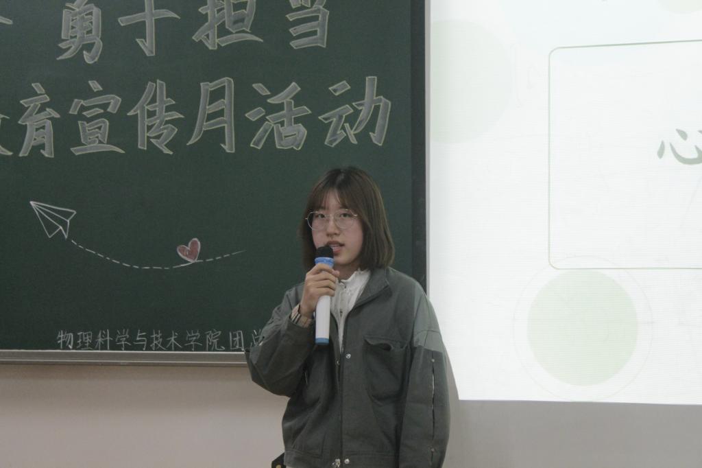活动开始,同学们通过扫描屏幕上方的二维码,关注公众号,进行心理健康测试,树立关爱自我,了解自我,接纳自我的意识。接着,各班心理委员依次上台演讲,阐述了自己对心理健康教育的看法。2020级数理基地班(物理方向)心理委员王桃讲述了抑郁症带给当代人们的心里隐患。2020级电子科学与技术专业心理委员韩牧泮妤给我们介绍了我们应该如何面对生活中的挫折,当我们发现自己有了心理问题时又该如何解决。2020级物理学类专业一班心理委员董书文向我们讲解了霍兰德职业测试,让我们明白对自己更加的了解会更有利于我们作出适合自己的职业规划。2020级物理学类专业二班心理委员宋茹玫介绍了“七号心理”公众号、小程序,可以为心理健康发展起到辅助作用。同学们的演讲引人深思,让我们了解内心深处不一样的自己,激励自己对生活的热情,正确面对生活中的困难,不逃避,不放弃。