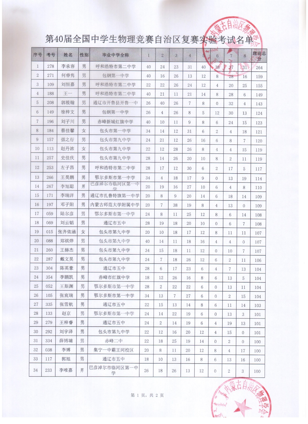 第 40届全国中学生物理竞赛复赛实验考试名单