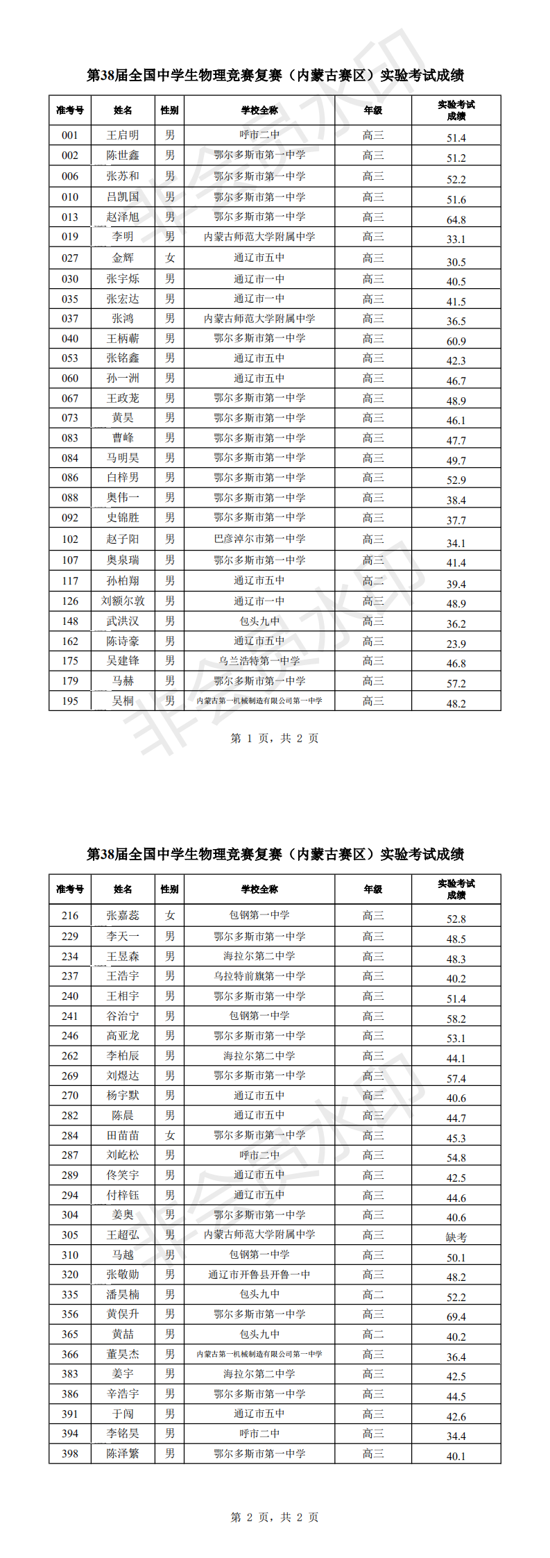 第38届全国中学生物理竞赛复赛(内蒙古赛区)实验考试成绩
