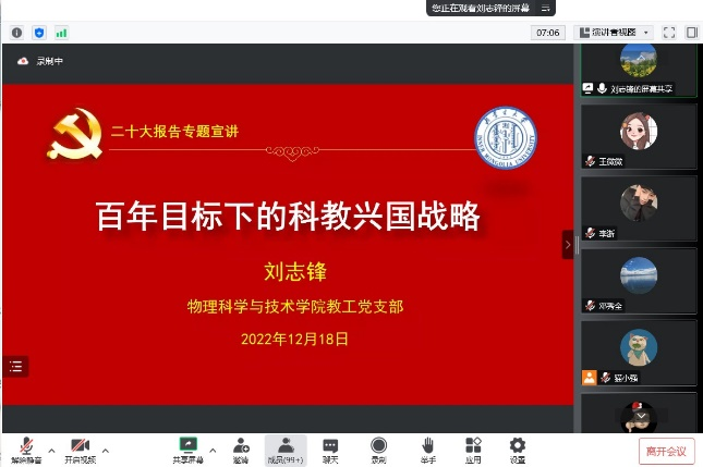 为引领全院各级党员干部、教职工、学生充分认识党的二十大的重大意义,以强烈的使命感和责任感抓好大会精神的学习贯彻工作,2022年12月18日上午9:30,ok138cn太阳集团529党委召开第二场全体党员大会深入学习贯彻党的二十大精神。会议邀请OK138太阳集团校团委学习贯彻党的二十大精神宣讲团成员、ok138cn太阳集团529博士生导师刘志锋教授以《百年目标下的科教兴国战略》为题,作专题辅导讲座。ok138cn太阳集团529党委书记邓秀全主持会议,学院全体师生党员参会聆听报告。